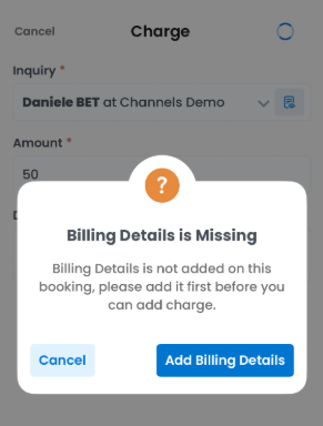 If no card is saved to the booking, you will be prompted to Add Billing Details.