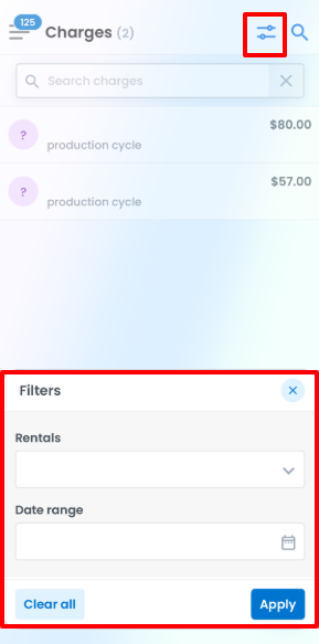 Tap the Filters icon to search by rental, or a specific date range. Select the desired fields and click Apply to filter the results.