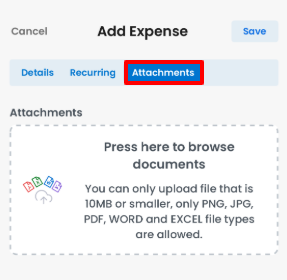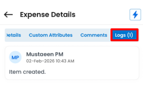 Logs – All activity logs related to this expense will be shown on this tab, including any updates or changes made to the record.