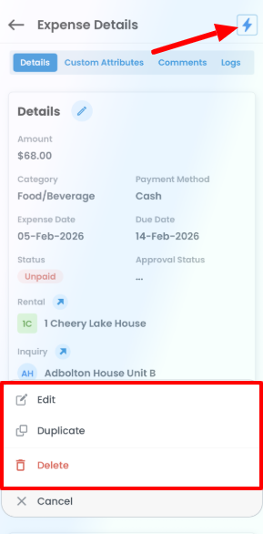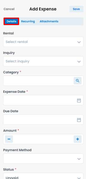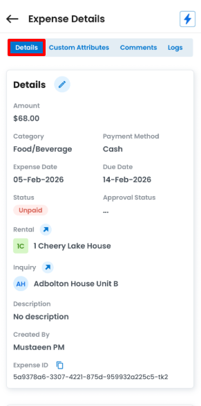 Details – Information relating to the expense such as category, rental, amount, due date, payment status, and description will be available here.