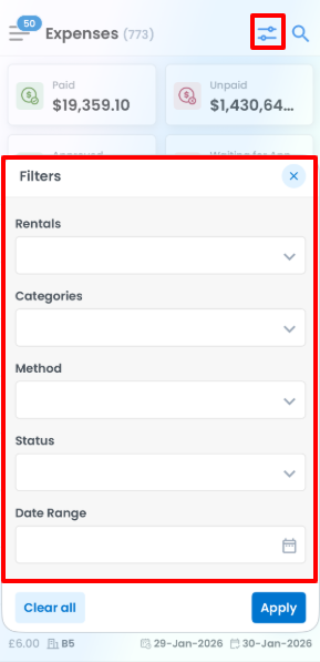 Tap the Filters icon to search using various criteria such as rental, category, method, status and date range. Select the desired fields and click Apply to filter the results.