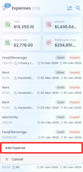 Use the Search icon to locate an expense by entering its name in the search bar, as shown in the screenshot below.