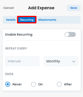 If the expense occurs regularly, open the Recurring tab and configure the recurrence settings by enabling the option then selecting the frequency (daily, weekly, monthly, or yearly) and the applicable end time.