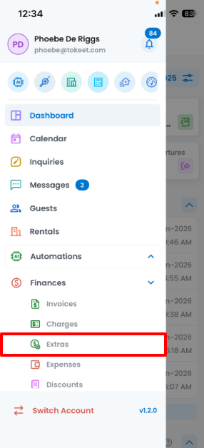 You can access the Extras Module from the left-side menu in the app, under the Finance option.
