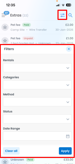 Tap the Filters icon to search using various criteria. Select the desired fields and click Apply to filter the results.