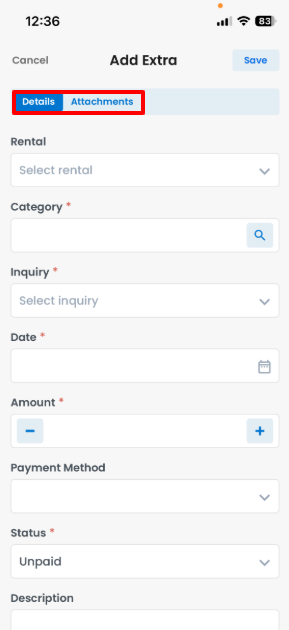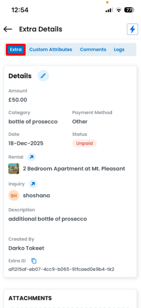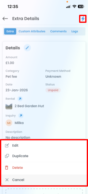 Extra - Information relating to the extra such as the rental, category, inquiry, date, amount, payment method, status and description will be available here.