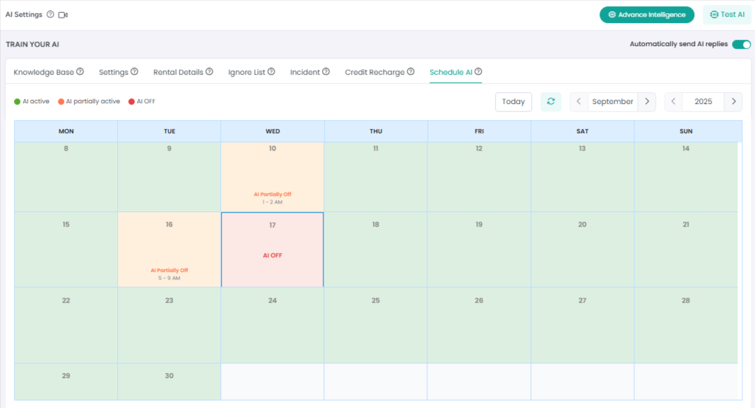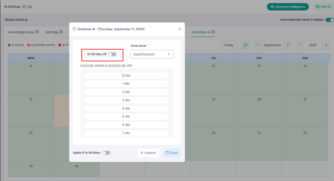 Using Apply it to all days toggle, you can make AI disabled for all future dates and AI will be disabled for all future months. Using this option you can also disable all future days for limited time slots only. For example you can disable 12AM-1AM slot for all future dates using this toggle.