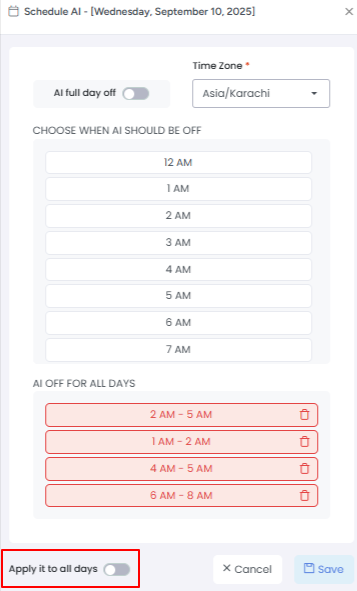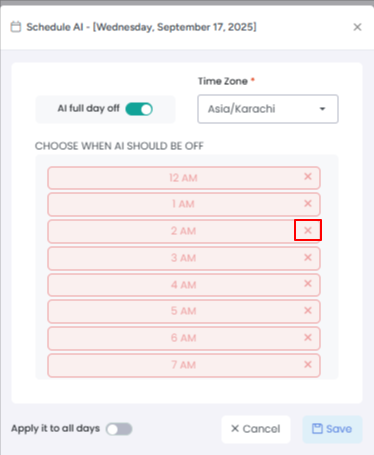 Choose any time slot if you want to disable AI for few hours in a day as mentioned in below screenshot,