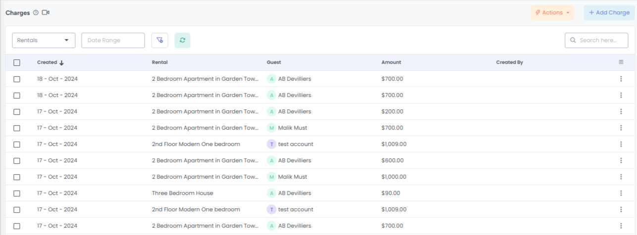 You can bulk delete or download multiple charges at once. Additionally, you can search for charges based on rentals and a specific date range.
