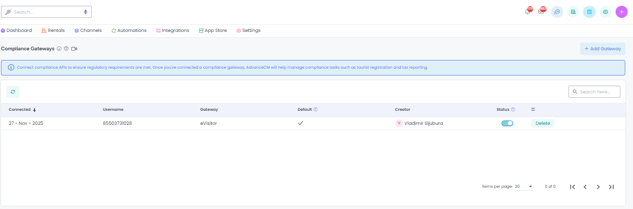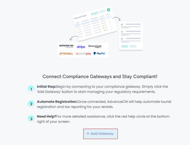 As no compliance software is integrated yet in the system, click on the "Add Gateway" button.