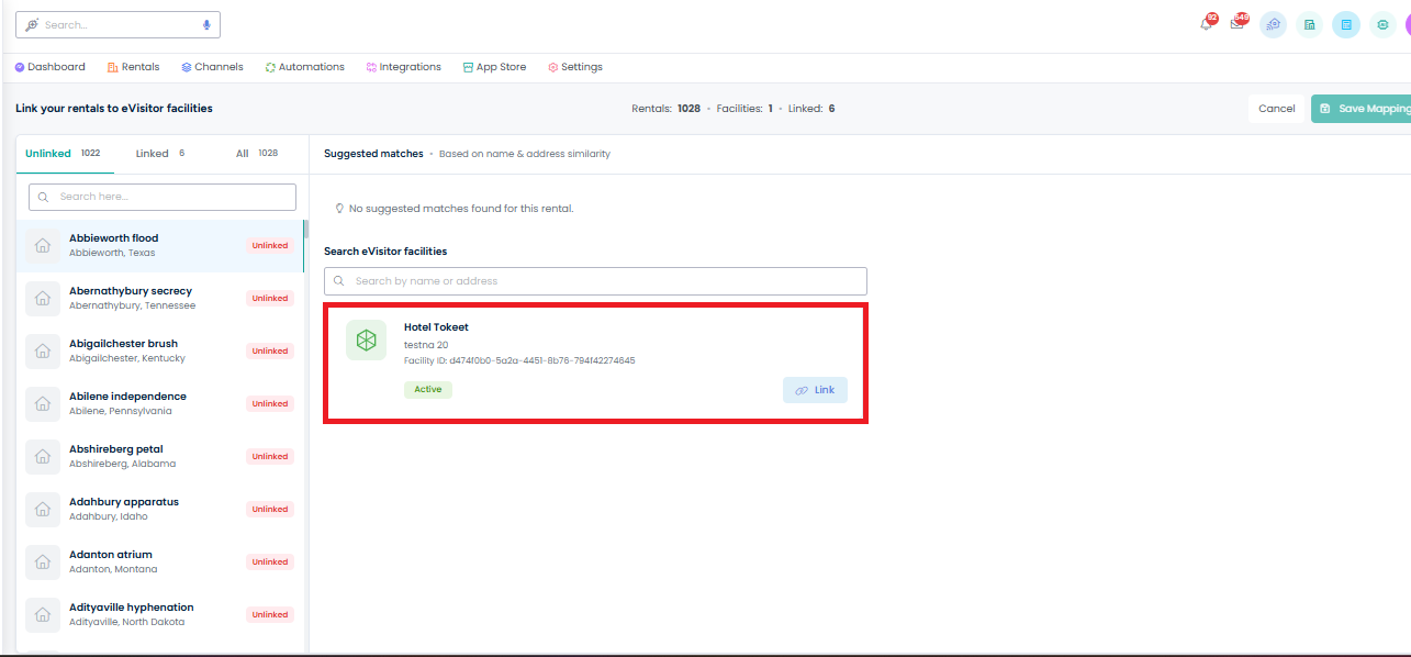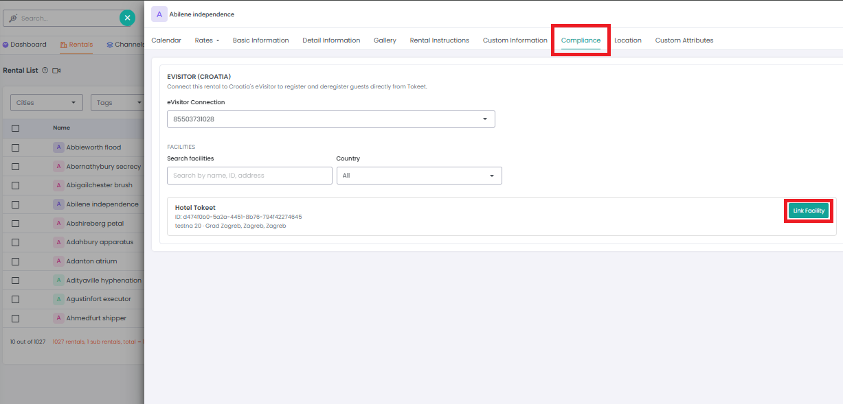 In eVisitor management systems, a "facility" refers to a specific, secure location (e.g., office building, school, hospital, or campus) where visitor traffic, check-in/check-out, and security monitoring are managedSelect the rentals you want to sync with eVisitor. Click the Link button to link the facility with the rental.