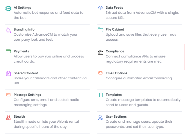 Log in to AdvanceCM: Click on Settings in the top navigation bar, then on the Compliance option.