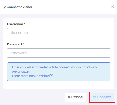 Enter Credentials: Input your eVisitor login credentials and click the Connect button.
