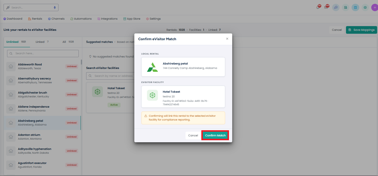 A popup will appear when the Link button is clicked on the above screen. It will show you a confirmation screen and clicking the Confirm Match button will link your rental to the Facility in eVistior.