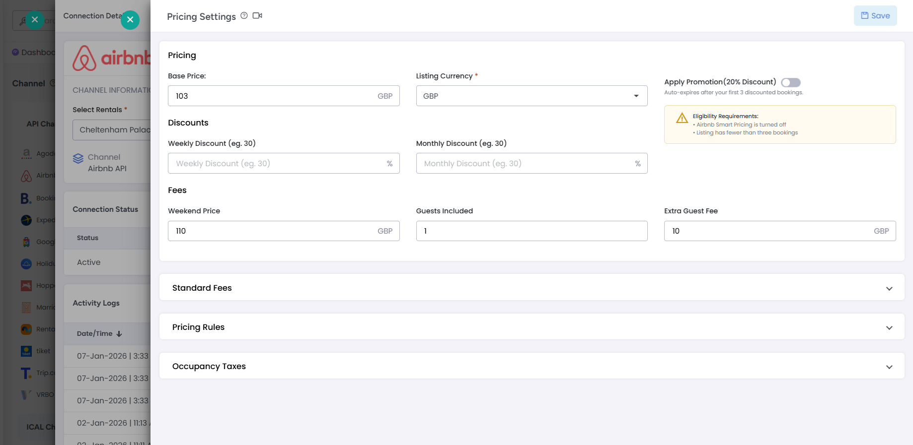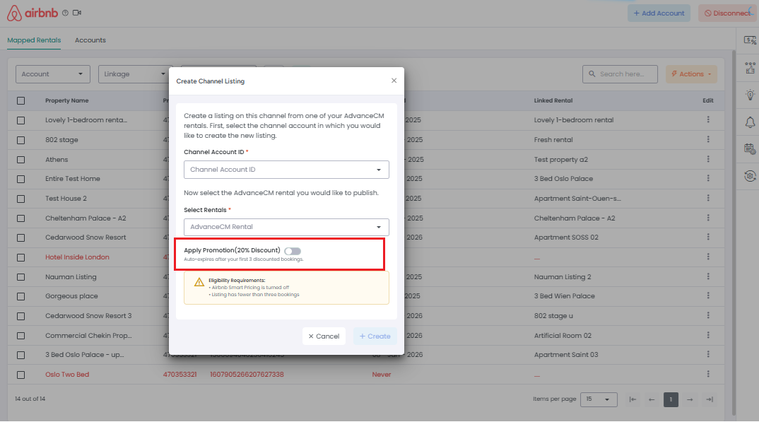 AdvanceCM allows hosts to enable Airbnb’s New Listing Promotion, which applies a 20% discount to the first three bookings for eligible new Airbnb listings. This feature is powered by Airbnb’s Promotions API and mirrors Airbnb’s native behavior and user experience.