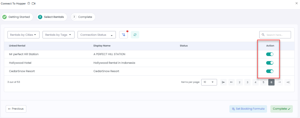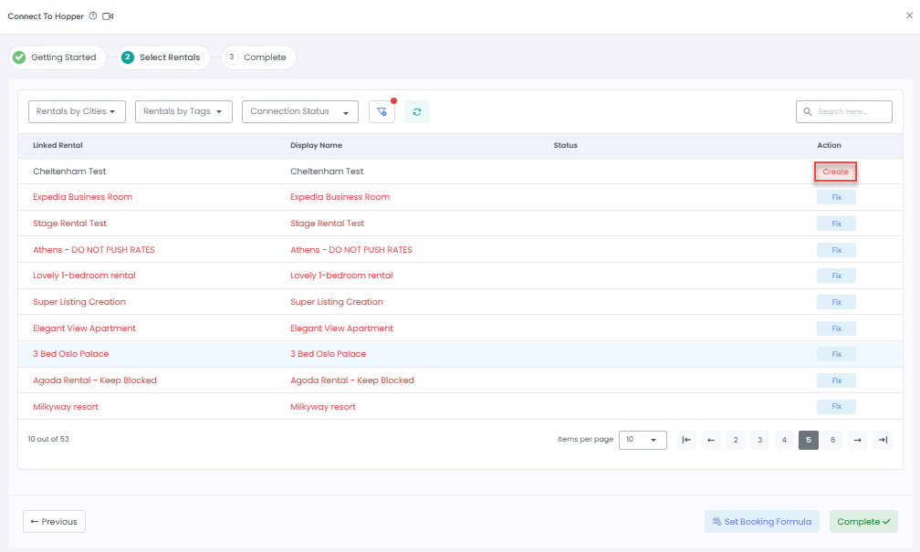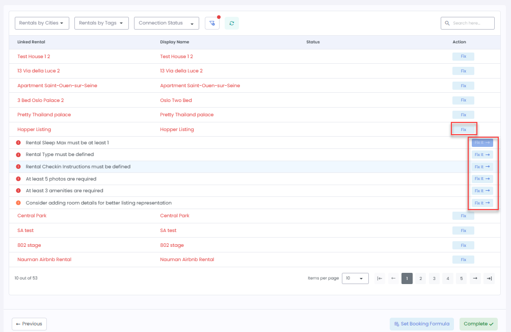 4. Next, you'll be prompted to Select Rentals. Rentals with data issues will have a Fix button next to them. Click Fix to view the issues, then resolve them one by one by clicking the Fix button for each row.