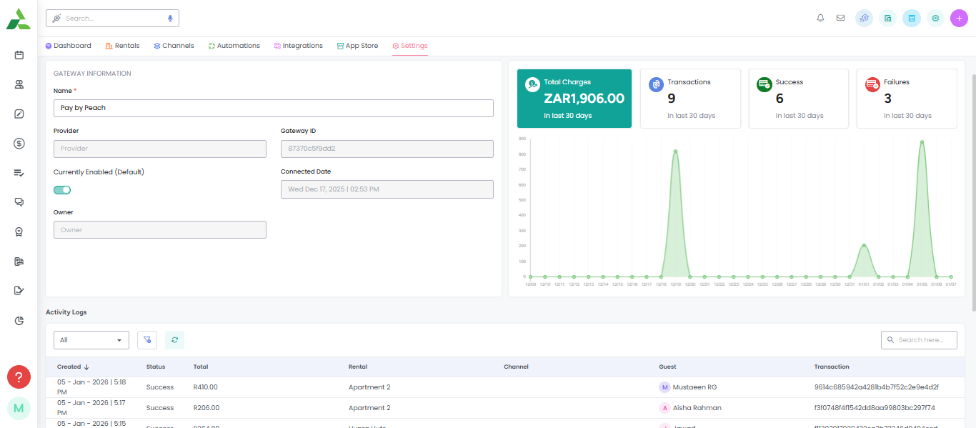3. Once the connection is established and payments are collected via the Peach Payment gateway, you can view stats and the activity log on the payment gateway details screen, as shown in the screenshot below.