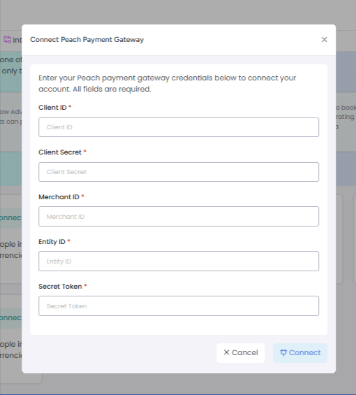 Once you click the Connect button, the Peach Payments interface will open. Enter all required Peach Payment gateway details, which you can obtain from your Peach Payments account.