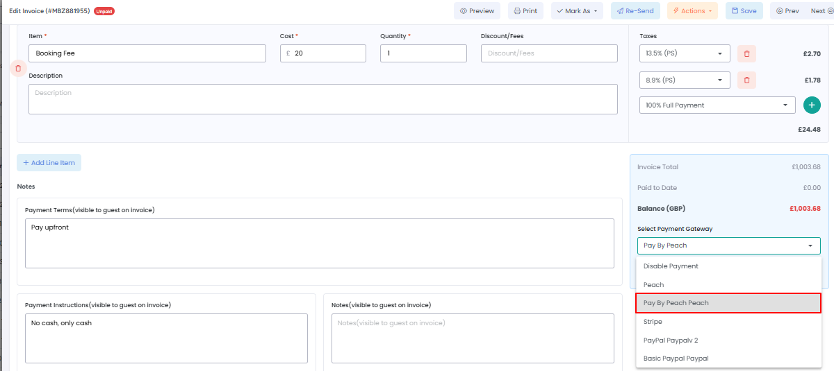 Once the Peach Payment gateway is connected, you can use it to collect payments for invoices directly in AdvanceCM.