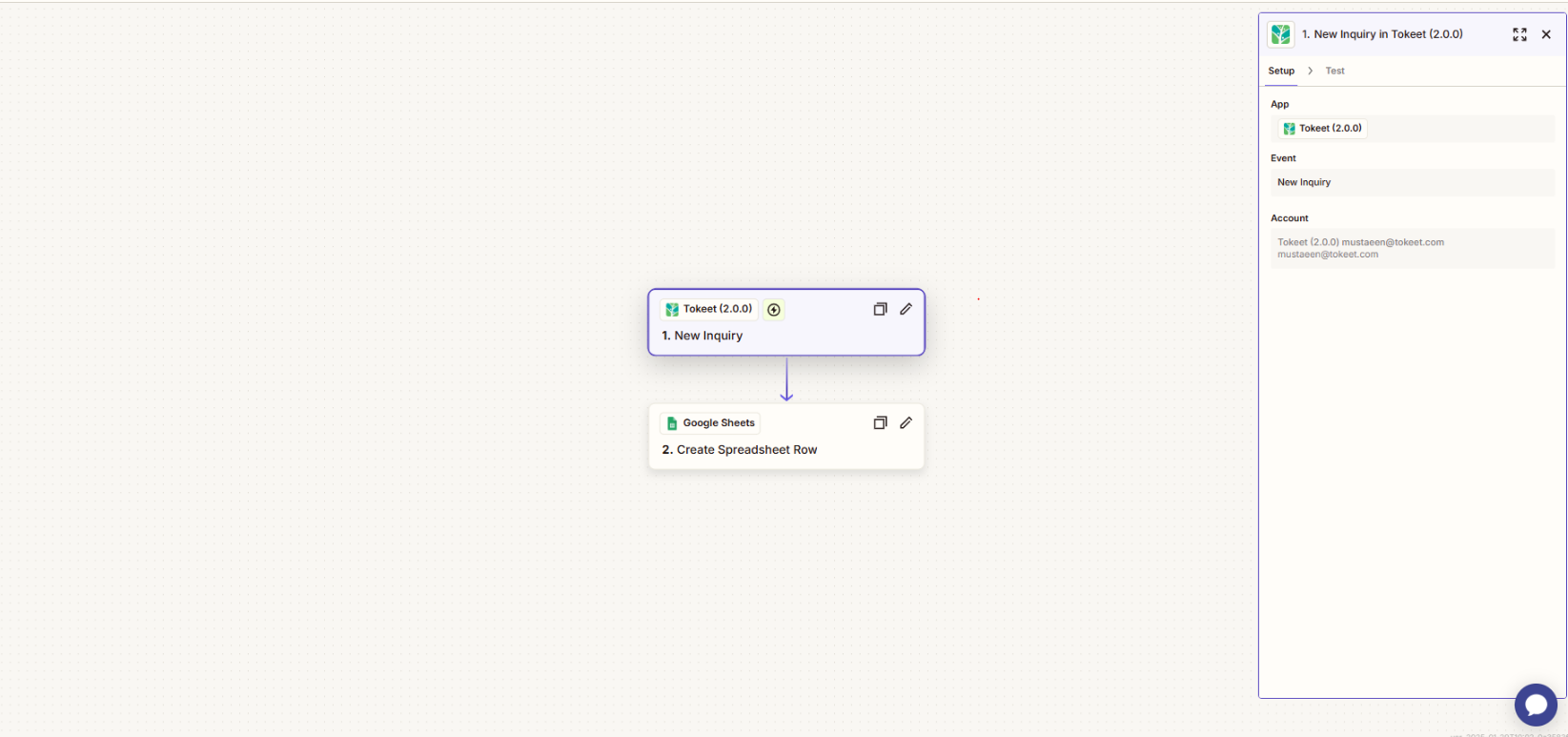 If "New Inquiry" is created, then execute an action (e.g., Create a row in Google Sheets).