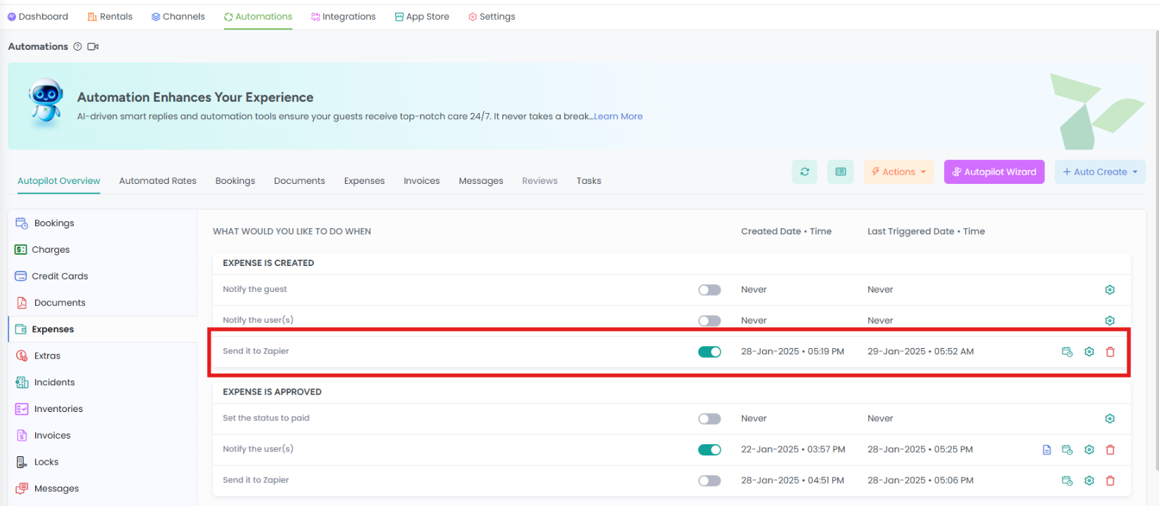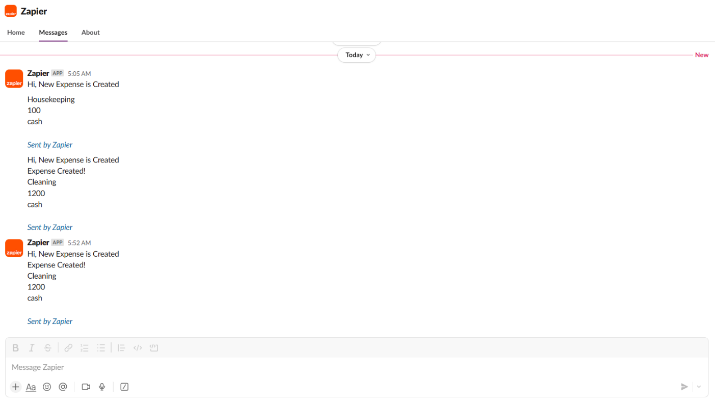 For example, in the screenshot below, if an Expense is created and the Zapier toggle is enabled, it will trigger a Zap already set up in Zapier. The Zap might have a trigger such as: