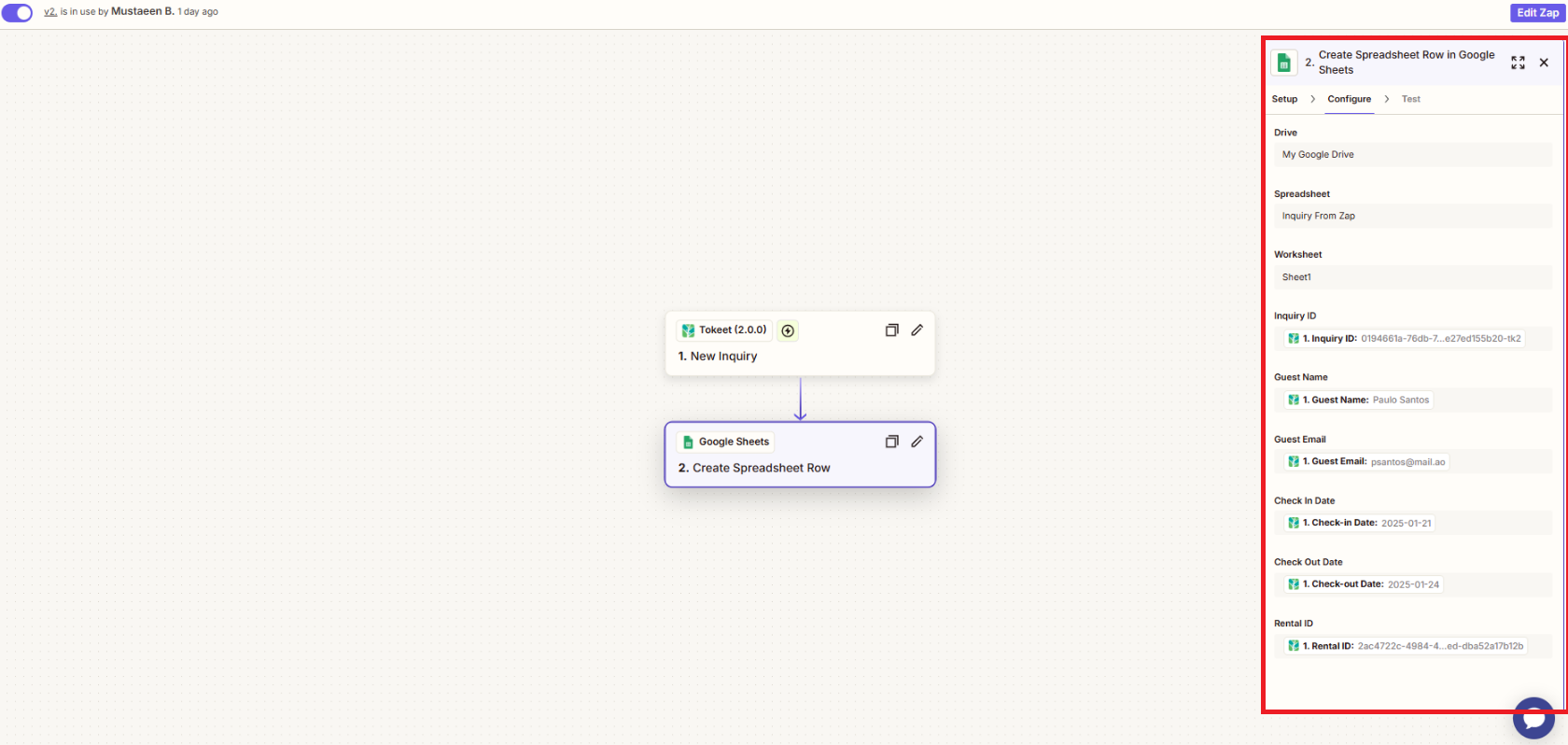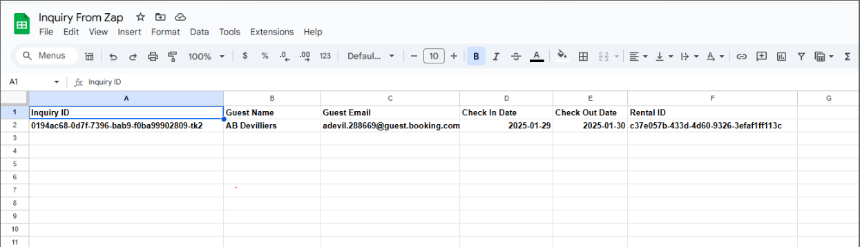 If you check the linked Google Sheet, you will see that an entry is made for the newly created Inquiry.