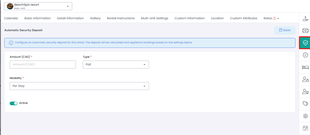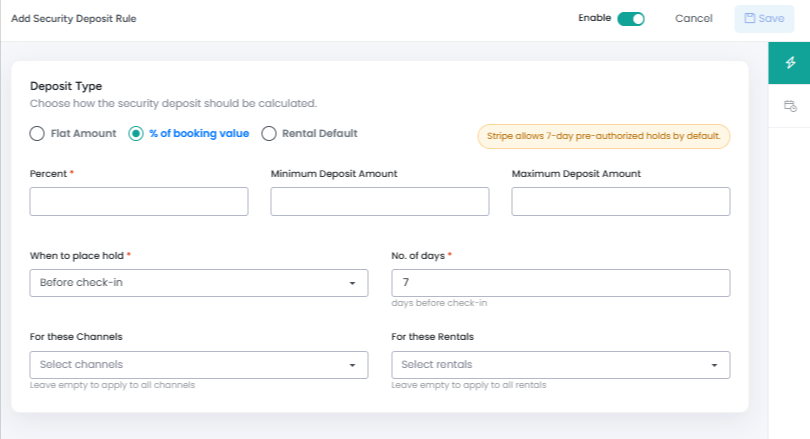Flat Amount - Set a fixed security deposit amount for all bookings.