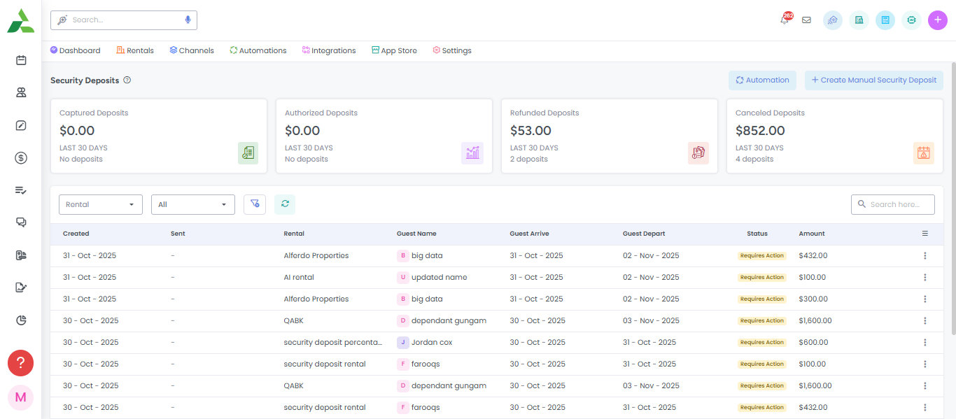 Here, you will see stats from the last 30 days, a list of existing security deposits, along with the option to create a new deposit or security deposit Automation.