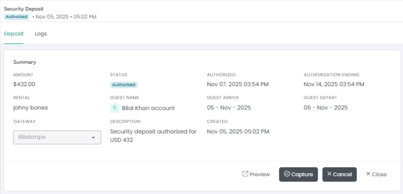 The Logs tab displays the full history of the security deposit, such as when it was captured, held, or refunded.