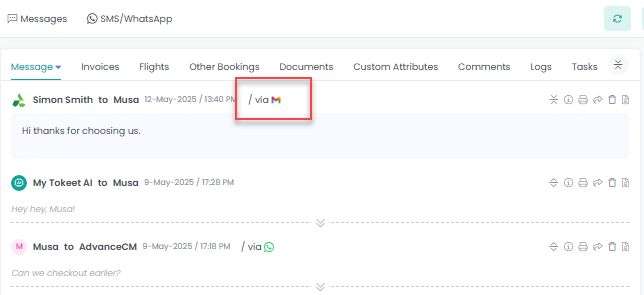 When you are responding to guests in the Inquiry Overlay or in the Inquiry Inbox, choose the Gmail option from the "Via" drop down as mentioned above. You can see the Gmail icon as shown below if any message is sent or received via Gmail.