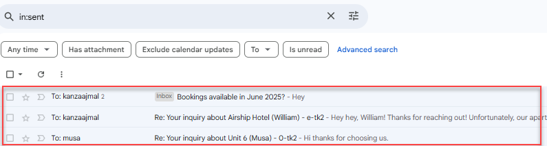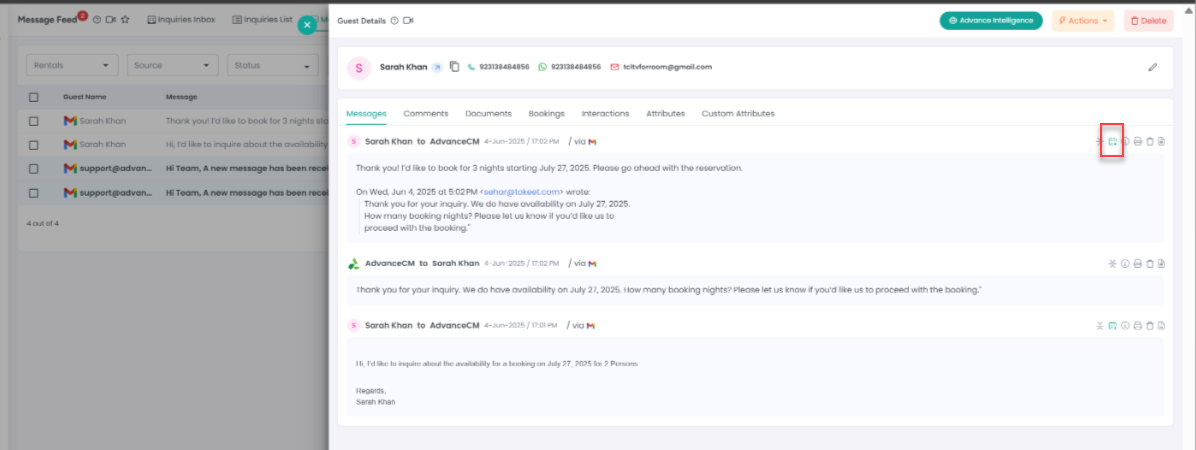 Property manager can respond back to guest using Gmail option and sent message will appear in Gmail Sent messages of property manager Gmail account