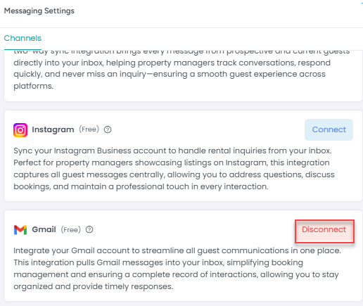 Property manager can disconnect Gmail connection under Message Settings by clicking Disconnect button. Your old gmail messages synced inside AdvanceCM will stay there.