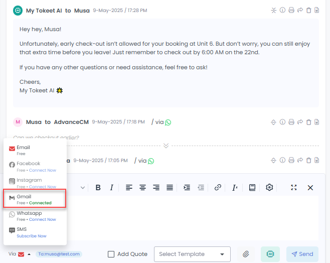 Integrating Gmail into a Property Management System (PMS) can significantly streamline communication and workflow. Gmail Messaging feature in AdvanceCM allows property managers and staff to communicate efficiently with guests directly within the platform. Whether you need to send booking confirmations or address guest inquiries, the messaging functionality in AdvanceCM provides a centralized, streamlined communication system.