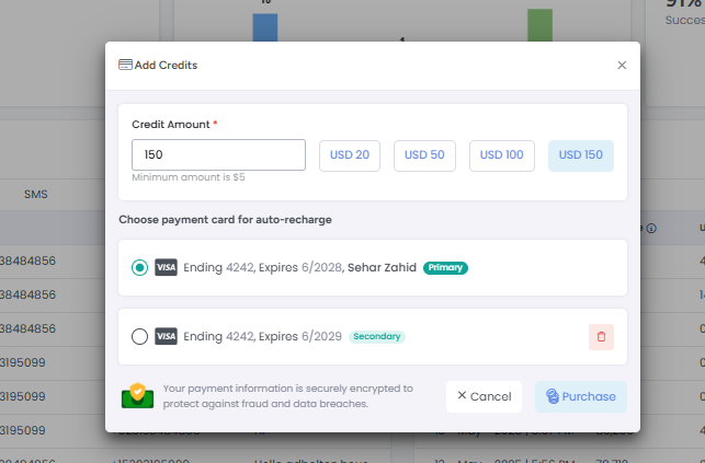 Click on Add Credit button and it will open popup with options to choose credit from available options or add any custom amount to recharge SMS credit.