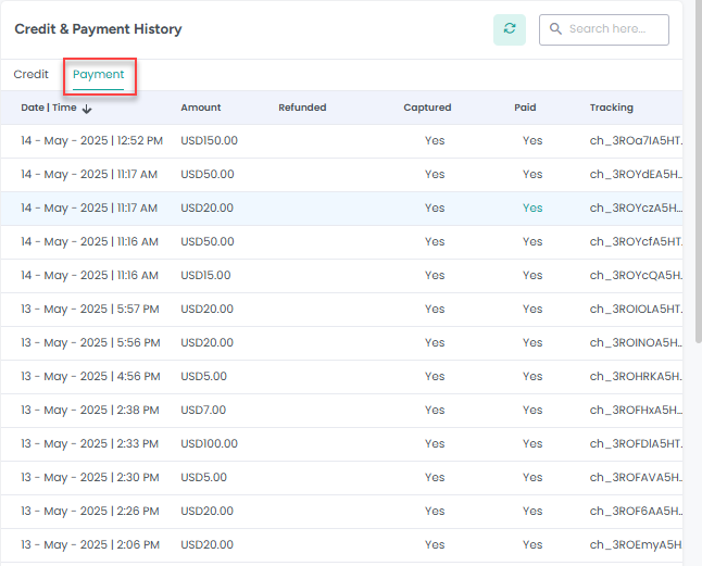 This tab covers all the credit recharges done by AdvanceCM user for SMS credit recharge using Add Credit button.