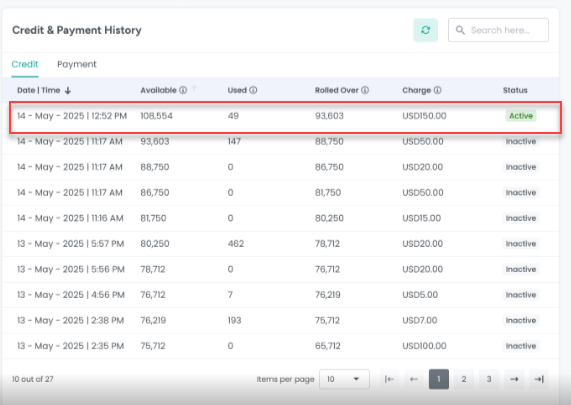 Status: Active status will be used for balance deduction. Whenever user add new credit, it will add new row and balance Available in previous credit will be added to new row's Available column. Inactive status items will not be useable.
