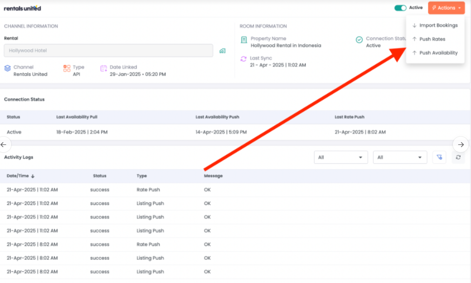 Activity logs show the most recent availability pulls, availability pushes, and rate pushes. This will reflect the most recent rate push and show if any errors were returned by the channel website when pushing rates.
