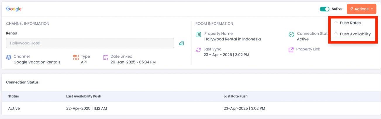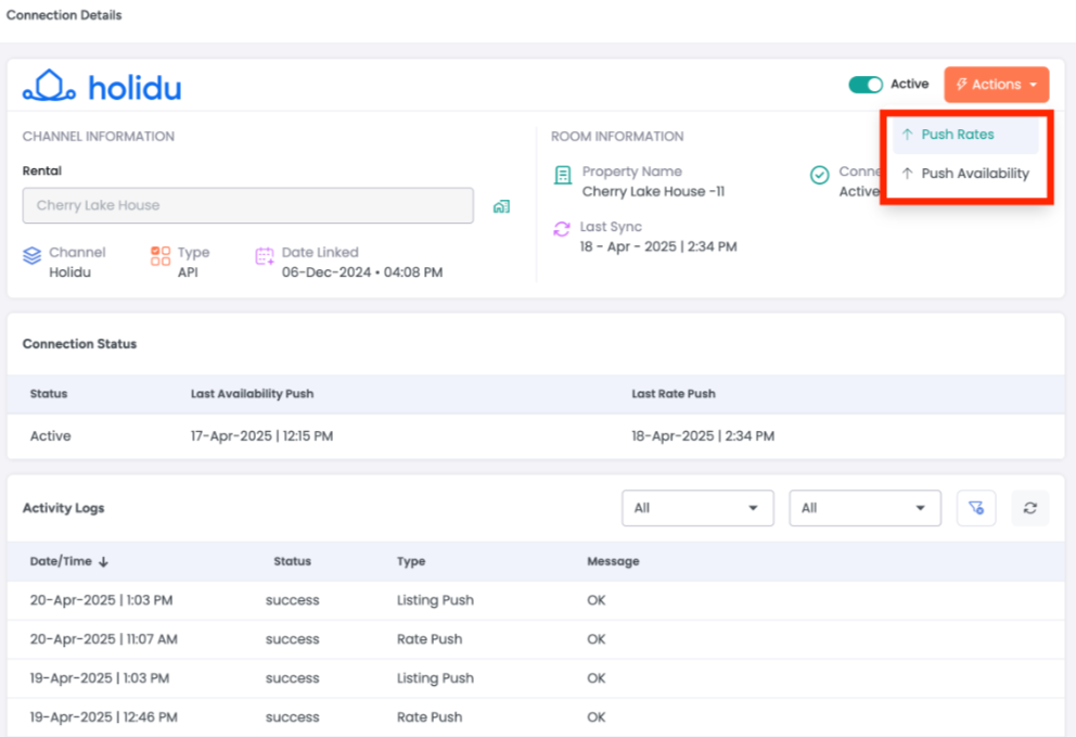 Similarly you can also push rates and availability to channels using Rate Push & Availability option available on top right corner. Learn more about this in this help article
