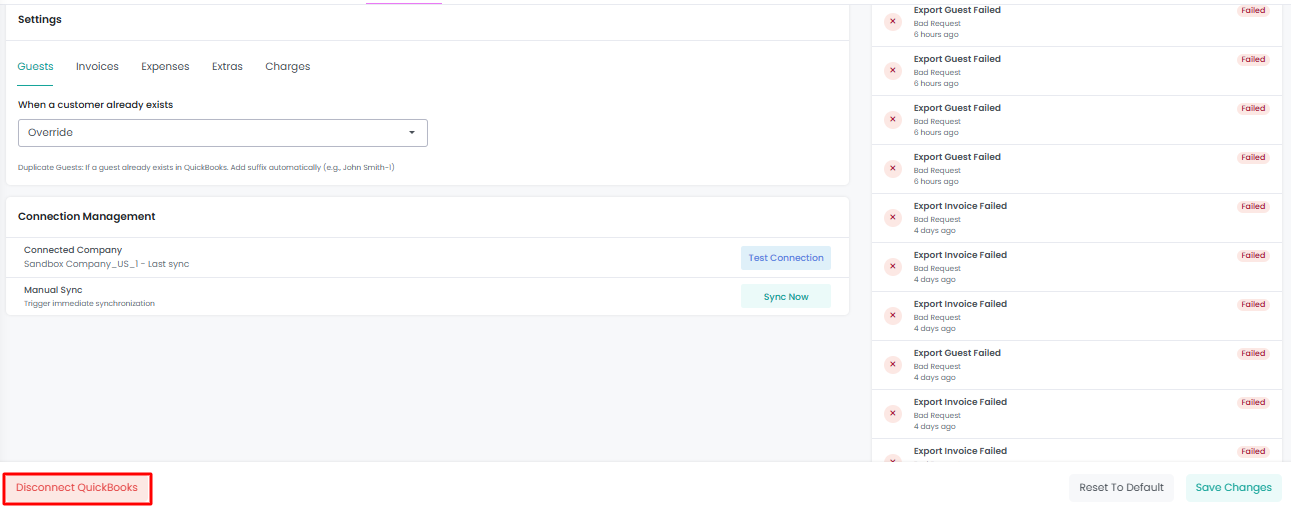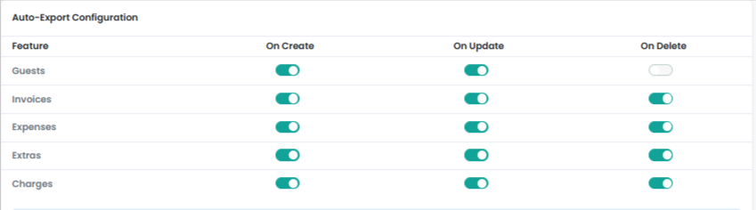 You can enable or disable different toggles. By default, all are enabled except the Delete toggle for Guests, which is not supported. Guest information cannot be deleted from QuickBooks if it is deleted from AdvanceCM.