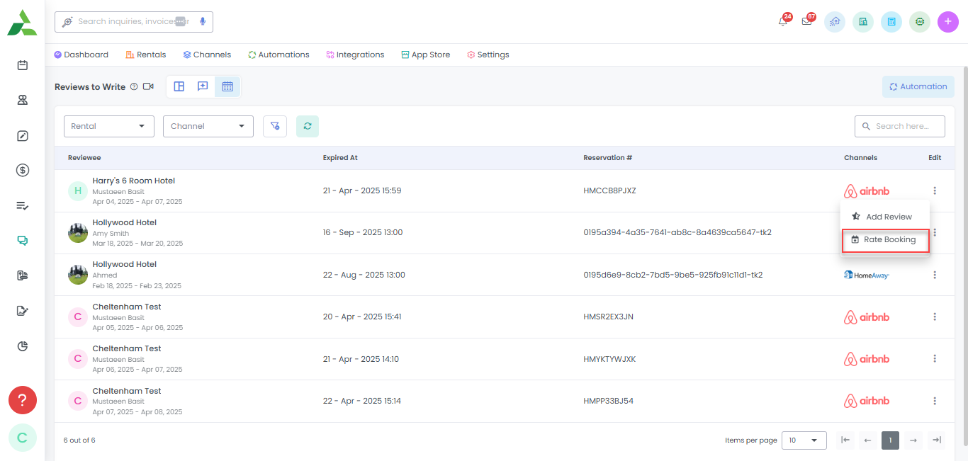 Under the Edit column, click the Rate Booking button to open an overlay to setup review automation