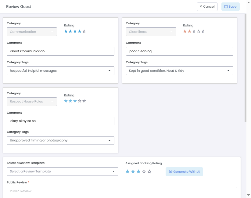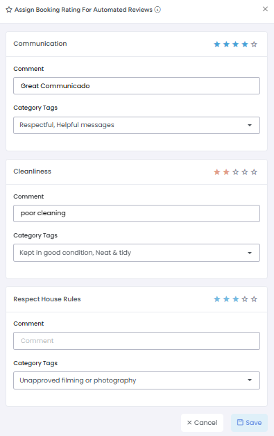 2. It will open overlay to set Comments, Stars and Category Tags for different categories. As Review automation is available for Airbnb channel only so these categories (Communication, Cleanliness, Respect House Rules) are coming from Airbnb.