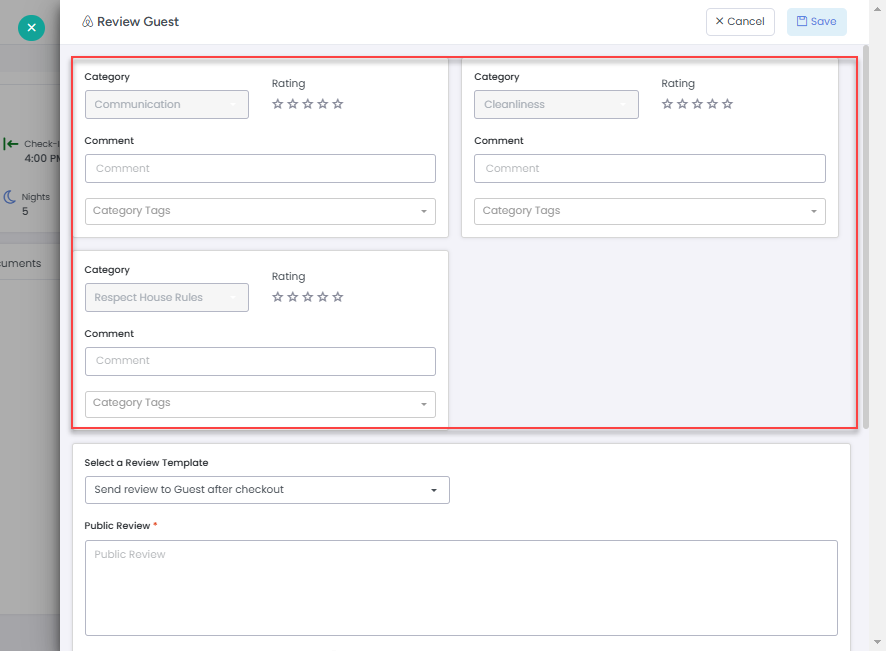 On Review Guest Overlay, you can review for below predefined categories only by selecting stars for rating