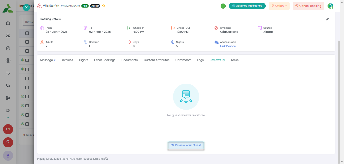 AdvanceCM allows you to send reviews to guests using "Review your Guest" button. This button is visible to those Airbnb bookings which are paid and checked out within last 14 days time period.