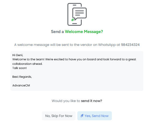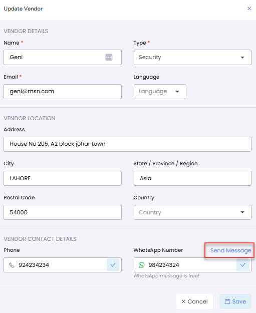 Property Managers can send a welcome message to a vendor's WhatsApp number, either during the vendor creation process or afterward via the Edit Vendor view.