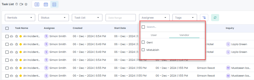 In the Tasks list view, you can filter by Vendor to view tasks assigned to specific vendors.