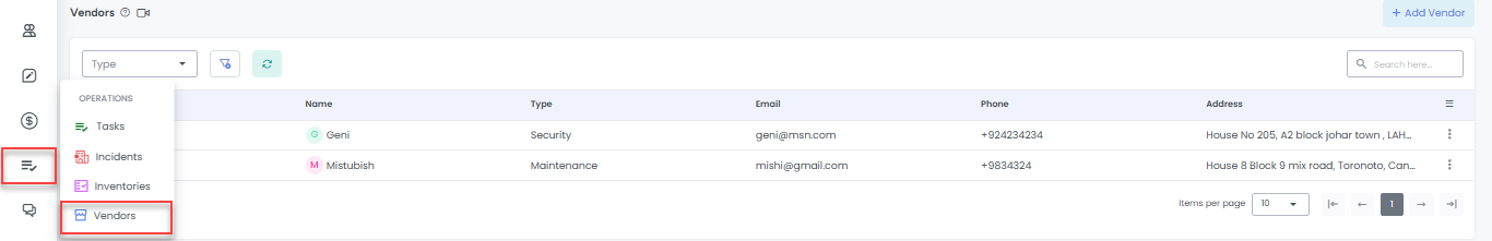 The Vendors list view provides search filters based on the vendor type, along with an option to create new vendors.