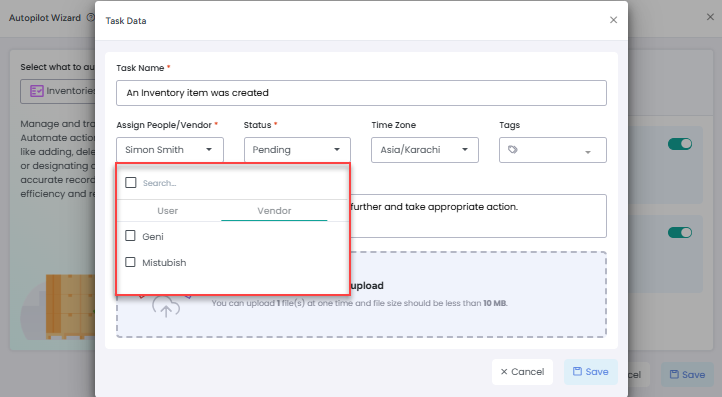 In both Automation and Autopilot workflows where tasks are created and assigned to users, you now have the option to assign tasks to vendors as well. Tasks can be assigned to both a user and a vendor at the same time.