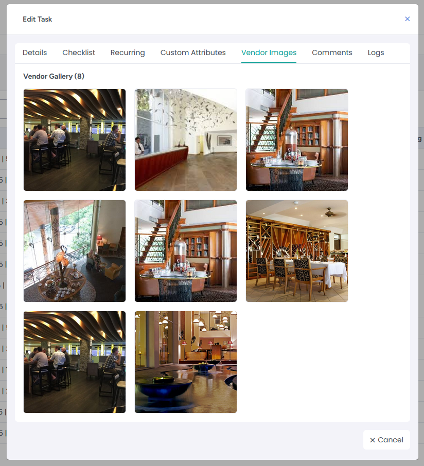 Within the Task Detail overlay, a Vendor Images tab will appear only if the vendor has uploaded images via the Vendor Web App. If no images have been uploaded, this tab remains hidden from property managers.