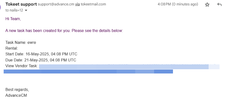 Once a task is created and assigned to a vendor in AdvanceCM, an email notification will be sent to the assigned vendor—only if the automation for notifying task assignees is enabled.