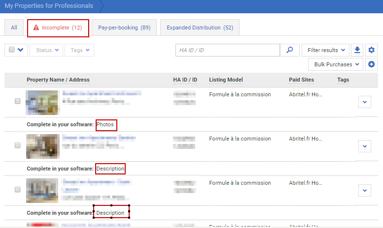Incomplete: Contains listings that have not gone live due to missing information. Vrbo will highlight the details that need to be completed.